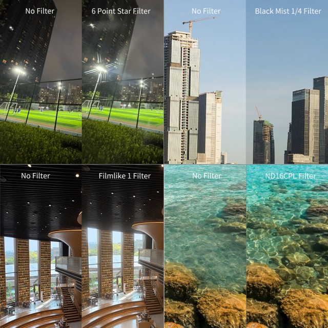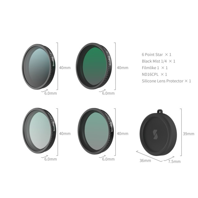 Tato sada obsahuje filtr 1/4 černé mlhy, filtr ND16 a CPL, filtr simulující film, filtr hvězdného kříže a silikonový kryt objektivu. Filtr 1/4 černé mlhy zjemňuje světla a vytváří snový, filmový efekt. Filtr ND16 & CPL eliminuje odrazy a zároveň zajišťuje věrnou reprodukci barev, takže je ideální pro fotografování krajiny a architektury za jasných podmínek. Filtr simulující film vytváří analogové filmové tóny, které jsou ideální pro portréty, pouliční fotografii a snímky ve stylu vintage. Hvězdicový filtr transformuje bodové zdroje světla na dramatické 6bodové třesky při nočních scénách. Pro větší pohodlí a ochranu obsahuje sada měkký silikonový kryt objektivu, který chrání objektiv fotoaparátu před poškrábáním a prachem, když se nepoužívá.