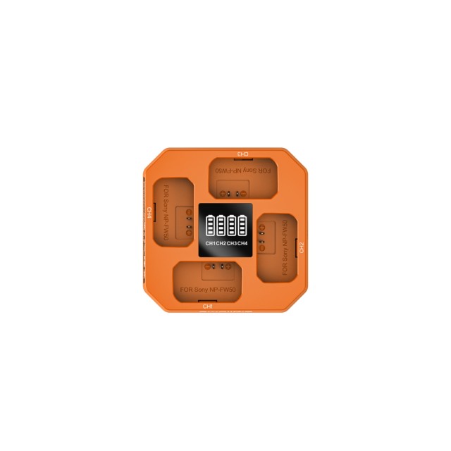 Čtyři vyhrazené kanály umožňují současné nabíjení čtyř baterií NP-FW50 a poskytují efektivní rychlé nabíjení, které splňuje náročné natáčecí plány.