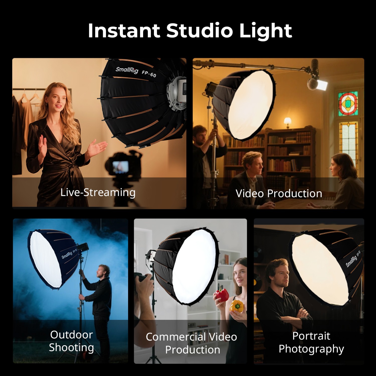 SmallRig FP-90 je skládací parabolický softbox s rychlým nastavením určený pro profesionální osvětlení. Je vybaven vylepšenou konstrukcí deštníku pro rychlé rozložení, dvouvrstvou difuzí pro měkké a rovnoměrné světlo a standardním držákem Bowens pro širokou kompatibilitu s většinou fotografických světel.