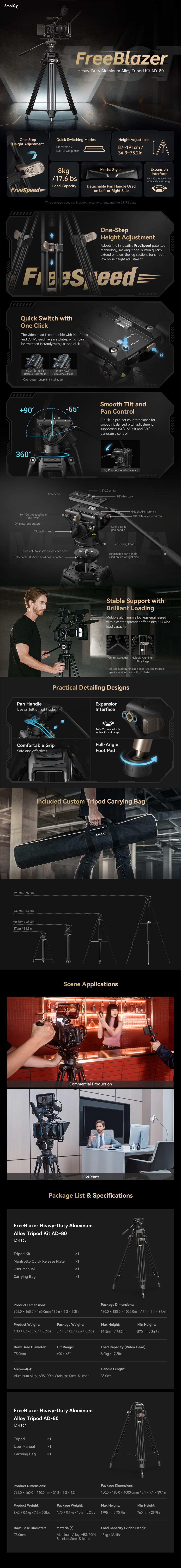 Stativ SmallRig FreeBlazer Heavy-Duty Aluminum Alloy Tripod AD-80 4164 je videostativ pro usnadnění natáčení videa. Stativ má nastavitelné nohy, které se rychle zasouvají a vysouvají pomocí flip-locků, s výškou od 76 cm do 179,5 cm a délkou ve složeném stavu 79,5 cm. Stativ je také vybaven jedním otvorem se závitem 1/4"-20 pro podporu magického ramene a dalšího příslušenství. Další funkce: nohy stativu z hliníkové slitiny, lehké a pevné; a přizpůsobená brašna pro lepší skladování, ochranu a přenášení.