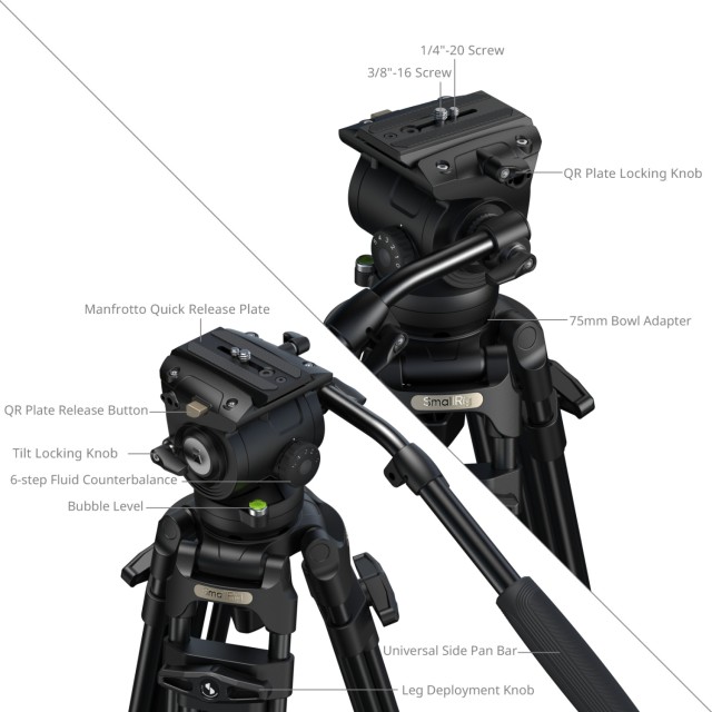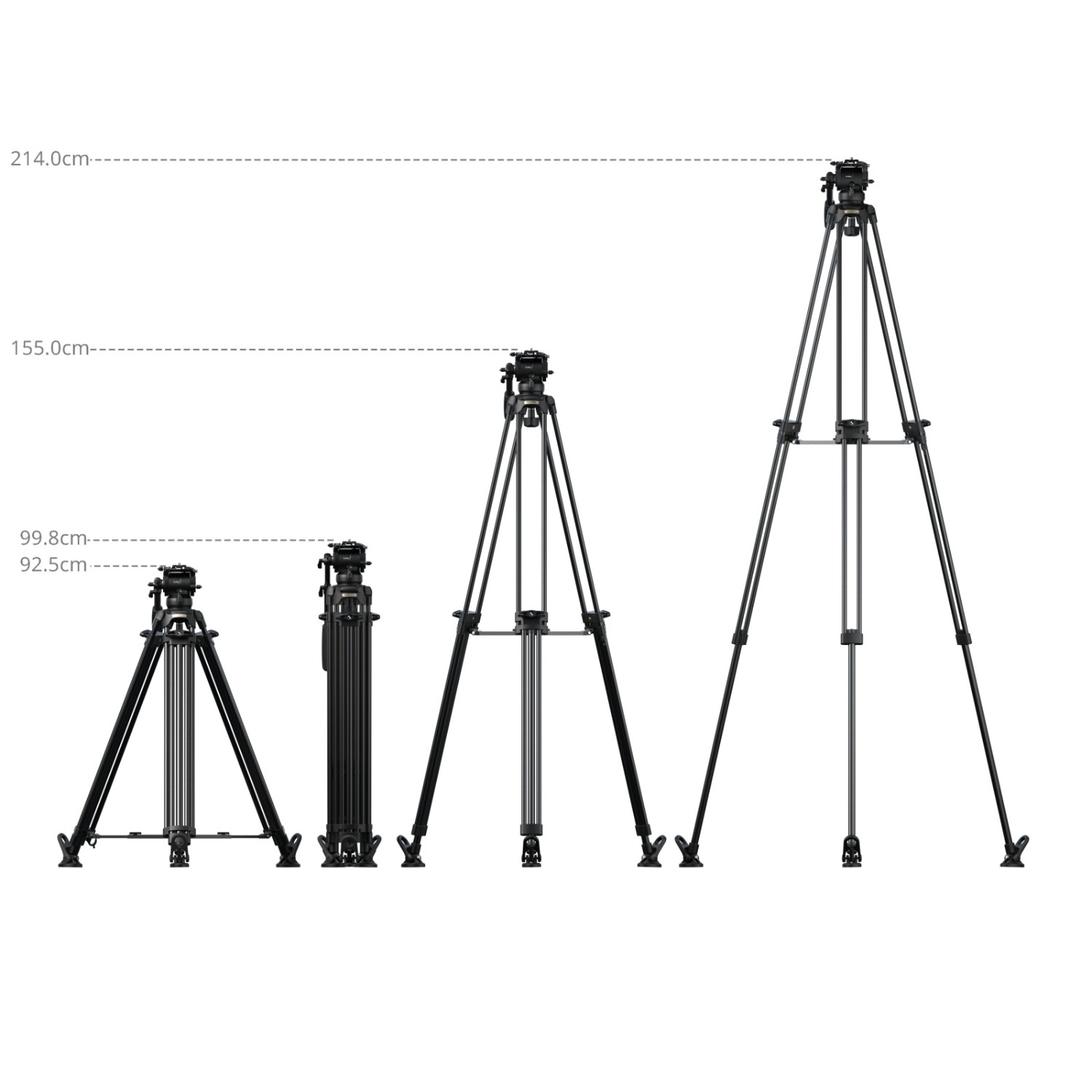 Stativ je vyroben z hliníkové slitiny (Ø16 mm) ve 3 sekcích, konfiguraci 2-2-1 segmentů a standardní 75mm miskové základně a je vybaven fluidní hlavou s 6stupňovým vyvažováním. Vyvažovací mechanismus podporuje zatížení od 0 kg do 6 kg (0 lb až 13,2 lb), zatímco hlava nabízí bezpečnou provozní hmotnost 10 kg (22 lb) a maximální nosnost 15 kg (33,1 lb). Pracovní výška stativu se pohybuje od 92,5 cm do 214 cm (36,4 palce až 84,3 palce), což zajišťuje vysokou stabilitu při zatížení a plynulý pohyb při natáčení z vysokého úhlu.