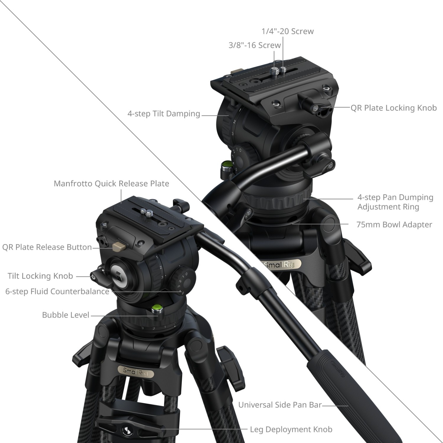 Stativ je vyroben z karbonových nohou (Ø16 mm) v 3sekční konfiguraci 2-2-1 a standardní 75mm miskové základně a je vybaven fluidní hlavou s 6stupňovým vyvažováním a nezávislým 4stupňovým ovládáním tlumení naklánění/otáčení. Vyvažovací mechanismus podporuje zatížení od 0 kg do 6 kg (0 lb až 13,2 lb), zatímco hlava nabízí bezpečnou provozní hmotnost 10 kg (22 lb) a maximální nosnost 15 kg (33,1 lb). Pracovní výška stativu se pohybuje od 93,6 cm do 214 cm (36,9 palce až 84,3 palce), což zajišťuje vysokou stabilitu při zatížení a plynulý pohyb při fotografování z vysokého úhlu.