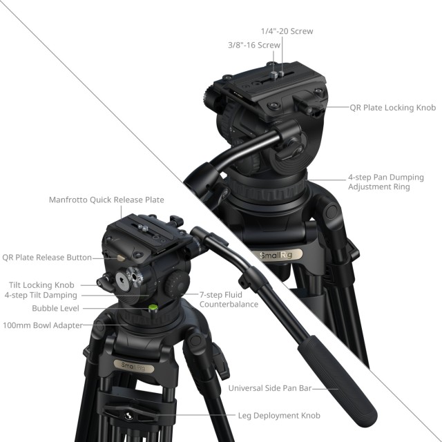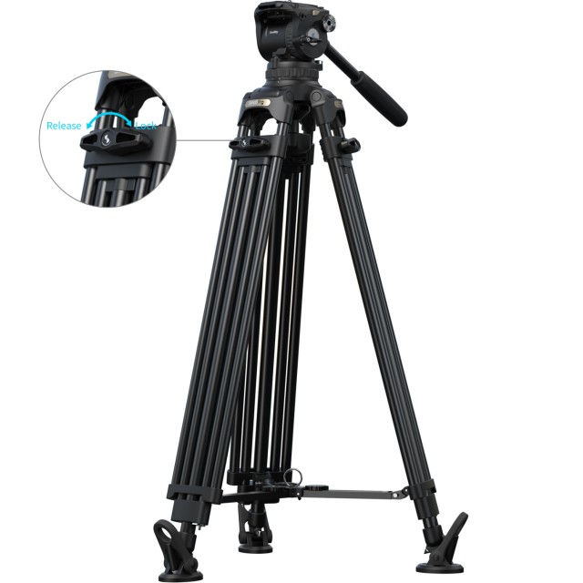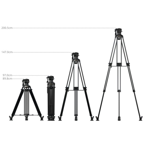 Stativ je vyroben z hliníkové slitiny (Ø18 mm) ve 3sekční konfiguraci 2-2-1 a standardní 100mm miskové základně. Je vybaven fluidní hlavou s 7stupňovým vyvažováním a nezávislým 4stupňovým ovládáním tlumení naklánění/otáčení. Vyvažovací mechanismus podporuje zatížení od 4 kg do 10 kg (8,8 lb až 22 lb), zatímco hlava nabízí bezpečnou provozní hmotnost 15 kg (33,1 lb) a maximální nosnost 17 kg (37,5 lb). Pracovní výška stativu se pohybuje od 89,8 cm do 200,5 cm (35,4 palce až 78,9 palce), což zajišťuje stabilitu při vysokém zatížení a plynulé pohyby při natáčení a zároveň podporuje scénáře natáčení z vysokého úhlu.