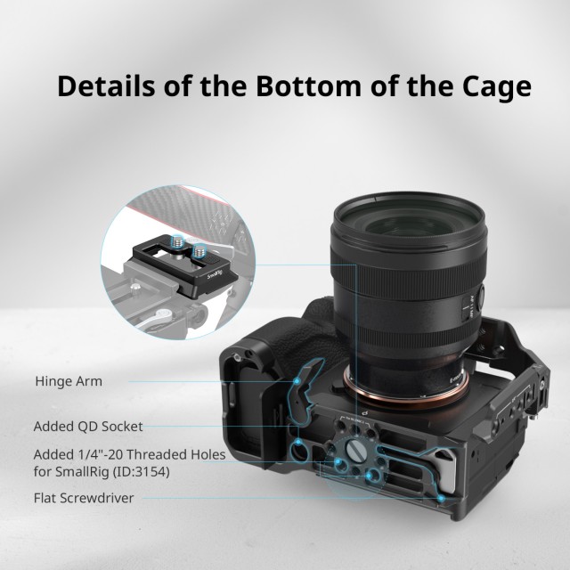Rychloupínací destička Arca ve spodní části je kompatibilní s DJI RS 2/RSC 2 a rychloupínací destičkou (podložkou) DJI RS 2/RSC 2 pro snímání se stabilizátorem. Volitelná svorka kabelu HDMI 3000 spolupracuje s kamerou Alpha 7 IV/Alpha 7S III a chrání rozhraní a zajišťuje stabilní přenos signálu během natáčení. Otvory na bocích a ve spodní části klece umožňují připevnit příslušenství, jako je ruční popruh PAC2456 a ramenní popruh PSC2428. Klec je navíc vybavena vestavěným magnetickým klíčem, který usnadňuje demontáž a montáž