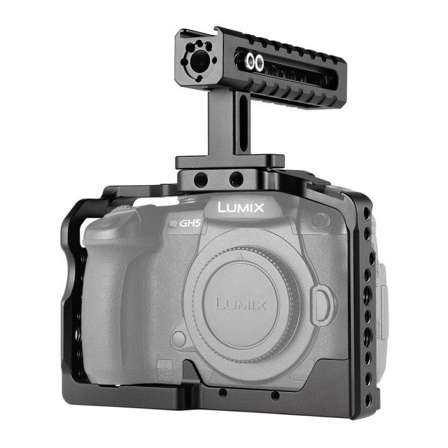 Klietka SmallRig GH5 s hornou rukoväťou 2050 obsahuje hornú rukoväť 1984 a klietku GH5 2049. Vrchná rukoväť a klietka sú spojené pomocou 1/4'' otvorov s protiľahlým otvorom, a tak ponúkajú kameramanovi priaznivý zážitok z držania v ruke. Hornú rukoväť možno nastaviť dopredu a dozadu v rozsahu 81 mm na udržanie rovnováhy pomocou skrutkového kľúča M5 podľa vašich potrieb počas snímania, pričom má integrovanú cold shoe s možnosťou pripojenia mikrofónu, 15 mm tyčovú svorku s držiakom pätice 1597, kĺbové rameno rozety (7") 1497 a bezdrôtový mikrofón atď.