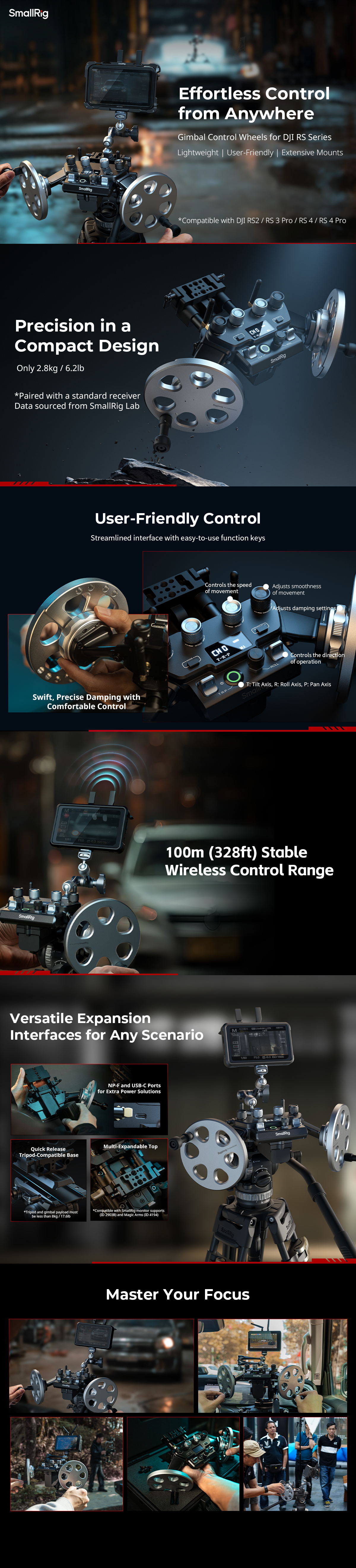 Ovládací kolečka SmallRig Gimbal pro DJI řady RS 4525 jsou navržena tak, aby zlepšila přesnost ovládání stabilizátorů DJI RS2, RS3 Pro, RS4 a RS4 Pro. Váží pouhých 2,76 kg, je přenosný a ideální pro natáčení na cestách. Ovládací kolečko je vybaveno uživatelsky přívětivým panelem s knoflíky pro nastavení rychlosti, plynulosti a tlumení, jakož i páčkami pro ovládání směru a nastavení osy TRP.