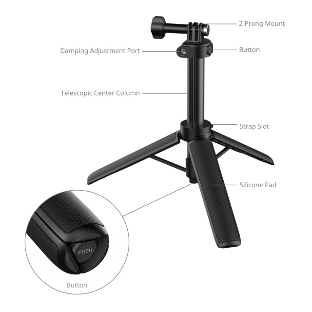 Je optimalizován pro přenosnost, jeho 4dílný teleskopický dřík se sklopí na 18 cm (7,1") pro snadné uložení do batohu nebo kapsy, ale lze jej vysunout až na 52 cm (20,5"), aby vyhovoval široké škále požadavků na výšku natáčení.