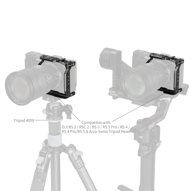 SmallRig Half Cage pro Nikon ZR 5905 je navržen tak, aby zlepšil rozšiřitelnost a zjednodušil montáž gimbalu. Jeho lehká konstrukce s polovičním krytem umožňuje snadnou instalaci bez nutnosti odpojení rychloupínací desky gimbalu DJI RS, což zjednodušuje ovládání a šetří čas. Základna je vybavena integrovanou rychloupínací deskou Arca-Swiss, která umožňuje přímou montáž na stativy typu Arca (ID 5290, 4222B) a gimbaly DJI (RS 2, RSC 2, RS 3 Pro, RS 4 Pro) pro rychlý přechod mezi nastaveními.