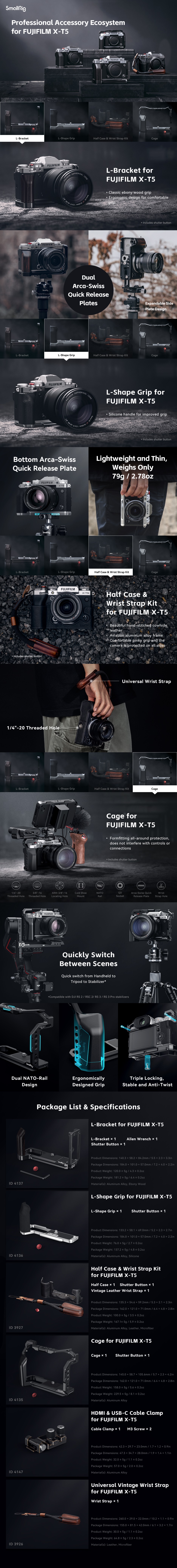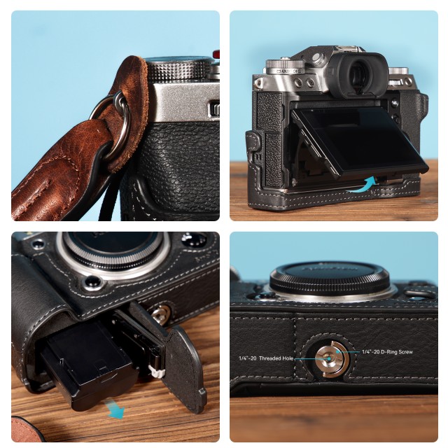 SmallRig Half Case / Wrist Strap Kit pro FUJIFILM X-T5 3927 je navržen tak, aby chránil fotoaparát a zlepšil zážitek z držení. Historické poloviční pouzdro, vyrobené z odolné a prodyšné hovězí kůže, se k fotoaparátu připevňuje pomocí šroubu s palcem 1/4"-20 ve spodní části. Zachovává plný přístup k výklopnému displeji, tlačítkům, bateriovému prostoru, slotu na karty atd. Vestavěný rám z hliníkové slitiny letecké třídy nejen dokonale padne na fotoaparát, ale chrání jej před poškrábáním a nárazy, přičemž základna z hliníkové slitiny zlepšuje držení. Kromě toho umožňuje spodní závit 1/4"-20 přímé upevnění pouzdra na stativ. A řemínek na zápěstí je vyroben z hovězí kůže a nylonu pro zvýšení pohodlí a spolehlivosti. Bezplatné tlačítko spouště pomáhá zlepšit dotykové ovládání.