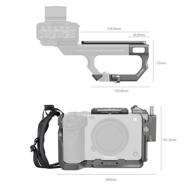 1. Sada ruční klece pro Sony FX30 / FX3, s popruhem na ruku pro usnadnění fotografování.