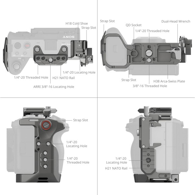 Sada SmallRig HawkLock Quick Release Advanced Cage Kit pro Sony FX3 / FX30 4771 je navržena tak, aby chránila kameru a poskytovala montážní body pro příslušenství, a tím zlepšovala zážitek z natáčení. Prodloužení rukojeti XLR je ergonomicky navrženo tak, aby zlepšilo úchop a pevnost původní horní rukojeti XLR pro snadné rozšíření příslušenství. Speciální svorka pro kabel HDMI chrání rozhraní a zajišťuje stabilní přenos signálu. Řemínek na ruku pomáhá zvýšit stabilitu a bezpečnost. Patentovaná, vlastnoručně vyvinutá rychloupínací konstrukce (pojmenovaná HawkLock) pokrývá studenou patici, lištu NATO a destičku Arca-Swiss. Používá se ve spojení s ekologickým příslušenstvím HawkLock, jako je Magic Arm 4490, boční rukojeť 4485, svorka Arca-Swiss 4486 atd. pro dosažení hladkého zasunutí a samosvornosti pro zvýšení efektivity demontáže a opětovné montáže. Zároveň je kompatibilní s tradiční studenou botkou, svorkou NATO a ekologickým příslušenstvím Arca-Swiss Clamp. Kromě toho má klec vestavěné otvory se závitem 1/4"-20, polohovací otvor ARRI 3/8"-16, polohovací otvory 1/4"-20, zásuvku QD a otvor pro popruh a lze ji rozšířit o příslušenství, jako je Magic Arm 3873, Rod Clamp 3598, ramenní popruh QD a ramenní popruh PSC2428 pro profesionální tvorbu. Součástí balení je také magnetický klíč pro snadnou montáž a demontáž.