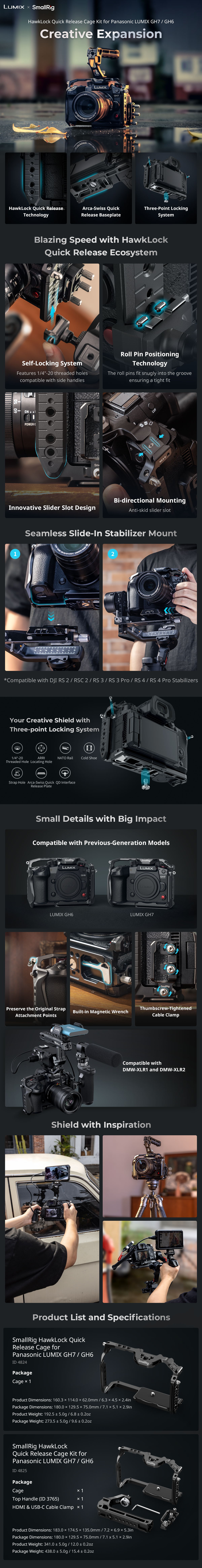Sada rychloupínací klece SmallRig HawkLock pro Panasonic LUMIX GH7 / GH6 4825 je navržena tak, aby usnadňovala pořizování záběrů z nízkého úhlu, chránila fotoaparát a zároveň nabízela širokou škálu úchytů pro příslušenství. Obsahuje klec, svorku pro kabely HDMI a USB-C a horní rukojeť. Patentovaná, vlastnoručně vyvinutá rychloupínací konstrukce (pojmenovaná HawkLock) pokrývá studené boty, lištu NATO a arca swiss, která se používá s ekologickým příslušenstvím HawkLock k realizaci pevné a žádné falešné polohy, jedním stisknutím se načte, uvolněním se zajistí a zlepší se efektivita demontáže.