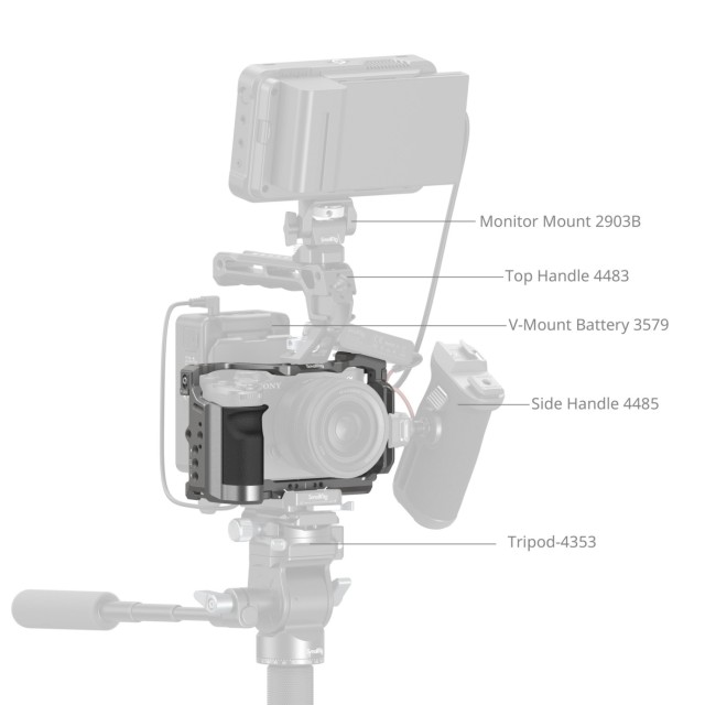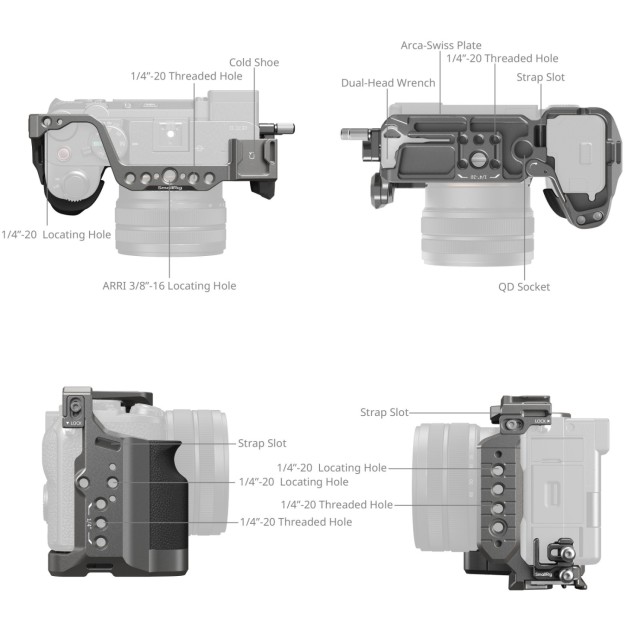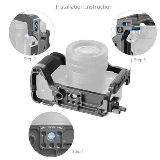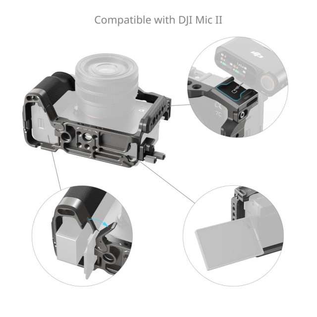 Klec je vybavena tříbodovým zajišťovacím systémem, který zajišťuje klec šroubem 1/4"-20 na spodní straně a dvěma polohovacími bloky na obou stranách, což zajišťuje pevné uchycení bez průhybu. Spodní silikonové podložky chrání fotoaparát před poškrábáním. Výklopné rameno u prostoru pro baterii navíc zlepšuje úchop tím, že poskytuje dodatečnou oporu pro malíček. Svorka kabelu HDMI je vybavena beznástrojovým upevněním zajištěným šroubem s palcem na levé straně klece, což zajišťuje stabilní připojení pro spolehlivý přenos dat.