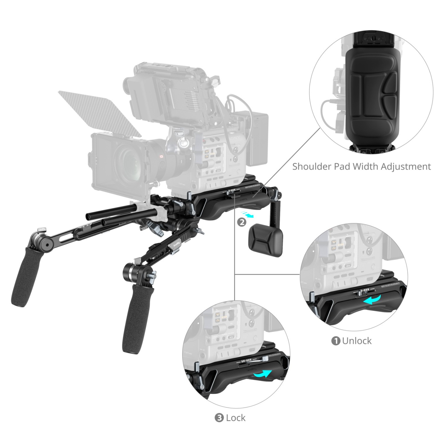 Ergonomický design pro delší natáčení: Teleskopické rameno se nastavuje o 50 mm (2 palce) do stran, aby vyhovovalo fotografům různých velikostí. Široká, zesílená a bočně nastavitelná ramenní podložka zajišťuje pohodlí, aniž by bránila ve výhledu. Adaptivní zadní podložka poskytuje další bezpečnost při natáčení z nízkého úhlu.