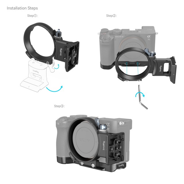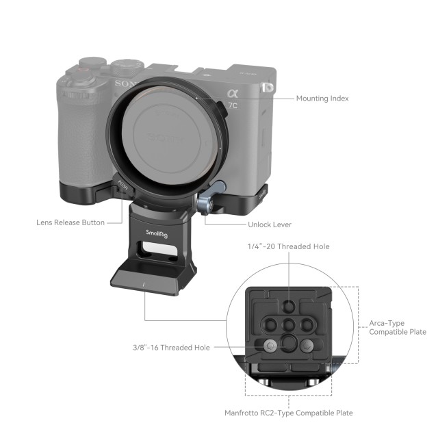 Sada SmallRig Horizontal-to-Vertical Mount Plate Kit pro Sony Alpha 7C II / Alpha 7CR 4570 je určena k rychlému přepínání mezi horizontálním a vertikálním režimem bez nutnosti upravovat optickou osu objektivu. Zajišťuje spodní část fotoaparátu pomocí šroubu 1/4"-20 a kolíku proti zkroucení a zachovává plný přístup k výklopnému displeji LCD a portům a je vybavena vestavěnými podložkami, které zabraňují poškrábání a zkroucení.