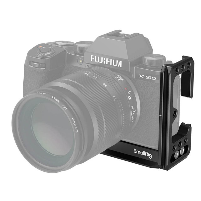 Držák SmallRig L-Bracket pro fotoaparát FUJIFILM X-S10 3086 je modulárně navržen s přírubami proti zkroucení, které zabraňují zkroucení fotoaparátu a zajišťují pohodlné uchopení. Základní deska i boční deska jsou kompatibilní s typem Arca dovetail a umožňují montáž kamery ve svislé nebo vodorovné poloze. Každá osa je vybavena středicí čárou snímače, která slouží k vyrovnání fotoaparátu na hlavě stativu. Ke spodní části fotoaparátu se upevňuje pomocí šroubu 1/4 a je vybaven gumovou podložkou, která zabraňuje poškrábání fotoaparátu. Je vybaven několika otvory se závitem 1/4"-20 na boku pro příslušenství, jako je Cold Shoe 2736 a svorka kabelu HDMI 1822. Několik otvorů se závitem 1/4"-20 a 3/8"-16 na spodní straně slouží k upevnění příslušenství, jako je rychloupínací destička 1280. Boční desku lze posunout dopředu, abyste měli obrazovku LCD v úhlu 180°, a lze ji posunout doleva, pokud potřebujete více místa pro připojení nebo uvolnění kabelu. Na spodní straně je otvor pro připevnění řemínku na ruku. Součástí balení je vestavěný imbusový klíč a plochý šroubovák pro zajištění šroubu kamery, které jsou uloženy na spodní straně držáku L-Holder.