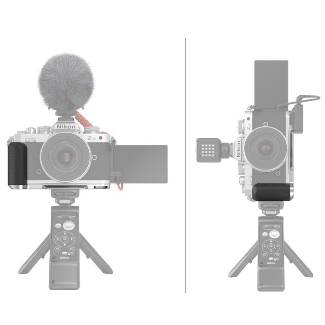 SmallRig Grip ve tvaru L pro fotoaparát Nikon Z fc 3480 je navržen tak, aby poskytoval pohodlné držení. Grip v retro stylu má podobnou strukturu a barvu jako fotoaparát; základní deska má stejnou stříbrnou povrchovou úpravu jako fotoaparát a dokonale sedí. Grip ve tvaru písmene L se k fotoaparátu upevňuje pomocí šroubu s kroužkem D 1/4"-20 na spodní straně a je vybaven vestavěným otvorem se závitem 1/4"-20 na gripu, který umožňuje fotografování na stativu ve svislé poloze. Základní deska je vybavena vestavěnou destičkou Arca Swiss pro rychlé přepnutí na fotografování ze stativu a otvorem se závitem 1/4"-20 uprostřed, který podporuje stativ nebo rychloupínací destičku Manfrotto. Kromě toho je základová deska vybavena vestavěnou cold shoe paticí, která umožňuje připevnění mikrofonu, světla a dalšího příslušenství; deska je také vybavena otvorem pro zápěstní řemínek. Grip využívá kompaktní a lehkou konstrukci, která se snadno přenáší.