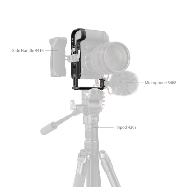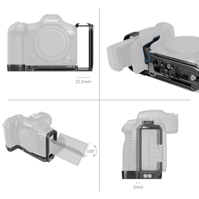 SmallRig L-Shape Mount Plate pro Canon EOS R5 Mark II 4983 je navržen tak, aby pomáhal rychle přepínat mezi orientací na šířku a na výšku a zároveň zlepšoval držení těla fotoaparátu. Montážní deska ve tvaru písmene L se pevně připevňuje k fotoaparátu pomocí šroubu 1/4"-20 v základně a dvou polohovacích bloků po stranách, které zabraňují vychýlení, a je vybavena vestavěnými silikonovými podložkami, které chrání fotoaparát před poškrábáním.
