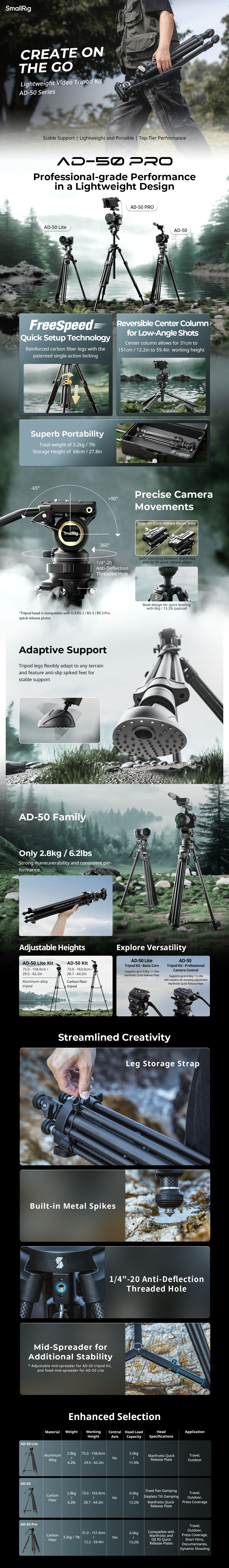 Sada lehkého videostativu SmallRig z uhlíkových vláken AD-50 Pro 4420 je určena pro profesionální outdoorovou videografii. Je vybaven technologií FreeSpeed, která využívá systém zamykání v jednom kroku - ovládání jediného přepínače umožňuje rychlé uzamčení dvou sekcí nohou. Nohy i středový sloupek jsou vyrobeny z uhlíkových vláken a zajišťují lehkou konstrukci při výjimečné stabilitě a vysoké nosnosti. Provozní výška se pohybuje od 31 cm (12,2 palce) do 151 cm (59,4 palce) a kompaktní skladovací délka je 68 cm (26,8 palce). Středový sloupek je vybaven integrovanou miskovou základnou, která umožňuje nastavení pro rychlé vyrovnání, s odnímatelným imbusovým klíčem zabudovaným ve videohlavě pro pohodlnou montáž/demontáž kamerového vybavení a možností natáčení pod nízkým úhlem v minimální výšce 31 cm (12,2 palce). Kompaktní konstrukce stativu umožňuje, aby se vešel do každého standardního zavazadla.
