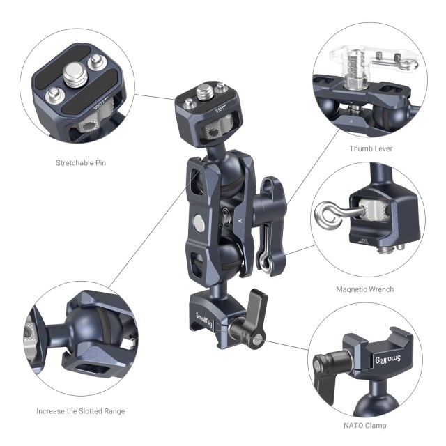 Rameno SmallRig Magic Arm s dvojitou kulovouhlavou (šroub 1/4"-20 a svorka NATO) 3875 je kompaktní a lehké. Obě kulové hlavy mají průměr 20 mm, přičemž jedna je vybavena šroubem 1/4"-20 a roztažitelnými kolíky, které zabraňují kroucení, a druhá má svorku NATO, která podporuje klec, horní desku atd. s lištou NATO. Nastavitelná páčka pro palec pomáhá zajistit kulovou hlavu ve vhodném úhlu a je dodávána s malým magnetickým klíčem ve spodní části, který slouží k utažení koleček pro palec. Na obou koncích svorky kulové hlavy jsou zářezy, které ponechávají více prostoru pro flexibilní nastavení kulových hlav i příslušenství na nich namontovaného. Tato položka váží pouhých 91 g, takže se snadno přenáší a skladuje.