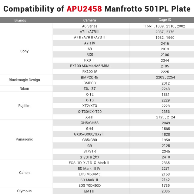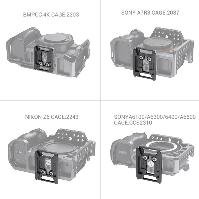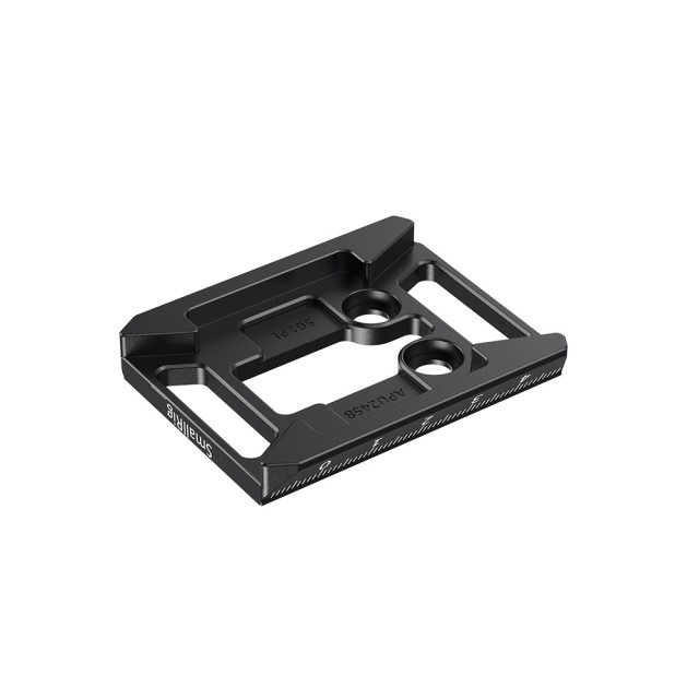 Rychloupínací destička SmallRig Manfrotto 501PL-Type pro vybrané klece SmallRig APU2458 má otevřenou střední část, takže přes destičku máte přístup k upevňovacímu šroubu kamery a můžete kameru snadno odmontovat z klece a přemístit ji na gimbal, stativ nebo jiné držáky, abyste zkrátili dobu výroby. Destička se připevňuje ke spodní části klece pomocí dvou přiložených šroubů 1/4"-20 a vejde se do standardní základny Manfrotto, je také kompatibilní s gimbalem DJI RoninS. Je kompatibilní s 30 klecemi od společnosti SmallRig, jako je klec 2203 pro BMPCC4k, klec 2087 pro Sony A7III a také klec 2243 pro Nikon Z6/Z7. Deska je opatřena gumovými podložkami, které chrání klec, a na spodní straně má konstrukci proti vyvléknutí, která zabraňuje zkroucení. Lehká destička váží pouhých 36 g.