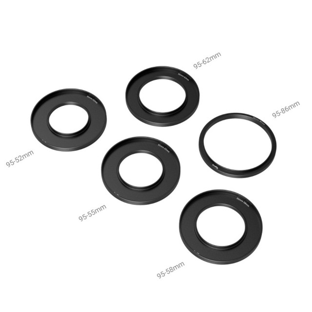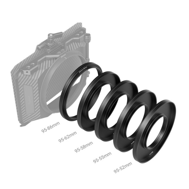 Sada adaptérových kroužků SmallRig (Φ52/Φ55/Φ58/Φ62/Φ86-Φ95) 3383 je volitelné příslušenství, které funguje s boxem Mini Matte Box 3196. Jeho adaptérové kroužky lze rychle připevnit ke standardním objektivům Φ52/Φ55/Φ58/Φ62/Φ86 a slouží jako pevná podpěra pro matte box. Adaptační kroužky přizpůsobují konstrukci proti vypadnutí, zabraňují náhodnému odpojení a zajišťují bezpečné a spolehlivé fotografování, pokud spolupracují s boxem Mini Matte Box 3196. Jsou kompatibilní s širokou škálou kulatých filtrů včetně CPL a ND filtrů do Φ92,5 mm a ponechávají dostatek prostoru pro rychlou demontáž a nastavení kroužků CPL filtrů. Sada je plně kompatibilní s různými objektivy a poskytuje uživatelům vynikající zážitek z fotografování, pokud jde o rychlou instalaci a přepínání scén.