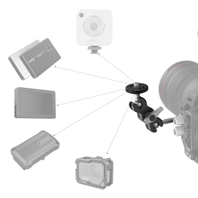 Rameno SmallRig Mini Magic Arm s univerzální ballhead 3238 se skládá ze dvou ball heads se šroubem 1/4"-20 a svorky ballhead. Na jednom konci jej lze připevnit k horní nebo boční části klece a na druhém k monitoru. Zabudované podložky zabraňují poškrábání. Je flexibilní a lze jej pohodlně nastavit do vhodného úhlu. Kompaktní a prostorově úsporné magic arm je vhodné pro fotografování s lehkým vybavením.