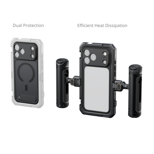 SmallRig Mobile Dual Handheld Kit pro iPhone 17 Pro 5540 je profesionální řešení pro ruční natáčení určené speciálně pro iPhone 17 Pro, které usnadňuje profesionální nahrávání videa, živé vysílání a produkci krátkých filmů. Tato komplexní sada obsahuje pouzdro na telefon, video klec, otočnou bezdrátovou boční rukojeť, otočnou boční rukojeť a měkký nárazník z TPU.