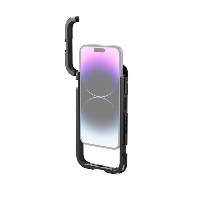 SmallRig Mobile Video Cage pro iPhone 14 Pro Max 4077 je multifunkční speciální klec určená pro iPhone 14 Pro Max pro profesionální videografii, živé vysílání a vlogování. Kompaktní, tvarově přiléhavá klec váží pouhých 98 g a je vybavena otvory se závitem 1/4"-20 proti zkroucení a úchyty pro studenou botku, které podporují příslušenství jako boční rukojeť, stativ, mikrofon a LED světlo, stejně jako popruh na ruku atd. Jeho zadní kryt objektivu je vyměnitelný a kompatibilní s objektivy s bajonetem M nebo 17mm závitem pro lepší kvalitu obrazu. Dutá konstrukce neblokuje tlačítka a porty iPhonu a umožňuje používat radary, ultraširokoúhlé objektivy a bezdrátové nabíjení. Díky konstrukci s rychlým zámkem se klec snadněji skládá a rozkládá, je bezpečnější a stabilnější, po uzamčení nevyskakuje kvůli náhodnému dotyku. Zadní desku objektivu lze otevřít v úhlu 30° a slouží jako stolní stojan. Kovově vyrobená plná klec spolu se zabudovanými podložkami chrání smartphone a zabraňuje vibracím a poškrábání. Klec umožňuje horizontální i vertikální fotografování.