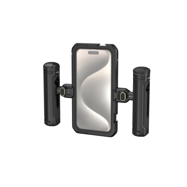Sada SmallRig Mobile Video Kit (Dual Handheld) pro iPhone 15 Pro Max 4392B obsahuje dvě rukojeti zajišťující stabilní natáčení videa a vlogování; bezdrátové ovládání umožňuje natáčení "jedním kliknutím". Klec má několik otvorů se závitem 1/4"-20 a studené patky pro upevnění rukojeti, stativu, mikrofonu, LED videosvětla atd. Všechny jsou vybaveny novým rychloupínacím ekosystémem SmallRig pro snadné a okamžité přepínání mezi natáčením v horizontální a vertikální orientaci. Také celokovová plná klec podporuje takové objektivy, jako je objektiv s bajonetem M nebo po výměně backplate objektiv se závitem 17 mm / 37 mm, objektiv Moment řady T. Je decentně vydlabaná, aby umožnila plný přístup k tlačítkům, portům, radaru a ultraširokoúhlému objektivu iPhonu a k bezdrátové nabíječce MagSafe, přičemž zabudované podložky zabraňují případným nárazům a poškrábání.