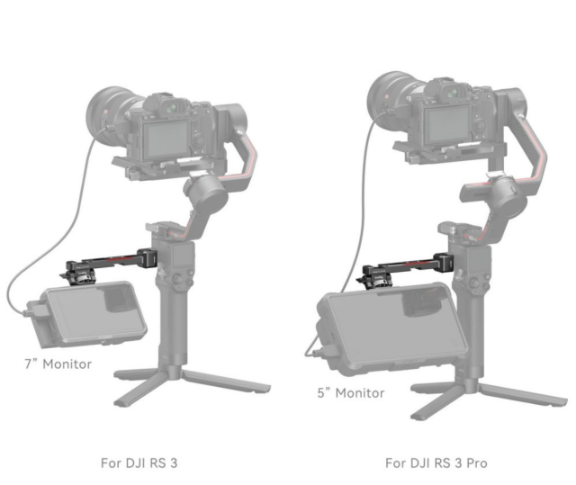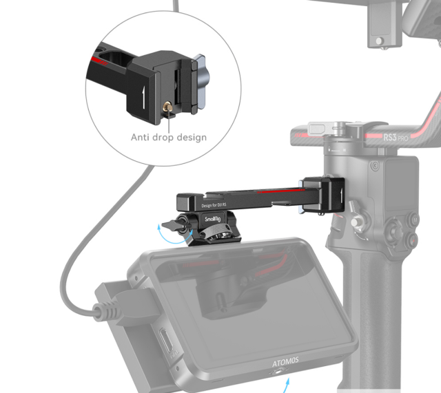 Držák monitoru SmallRig pro DJI RS 2 / RSC 2 / RS 3 / RS 3 Pro / RS 3 Mini 3026B je určen pro gimbaly DJI RS 2 / RSC 2 / RS 3 / RS 3 Pro / RS 3 Mini pro montáž dalšího příslušenství, jako je monitor, LED video světlo, přijímač zvuku, vysílač obrazu, akční kamera atd. Rychle se upevňuje na obě strany gimbalu pomocí svorky NATO, která je pro větší bezpečnost vybavena konstrukcí proti pádu, s knoflíkem pro palec, který umožňuje naklonit monitor až o 170°. K dispozici je několik bodů pro upevnění příslušenství, včetně dvou otvorů 1/4''-20 na horní straně pro rameno Magic Arm 3238 pro akční kameru nebo obrazový vysílač, a držáku cold shoe na horní a spodní straně pro zvukový přijímač, mikrofon, LED video světlo atd. Další zajímavostí je kolík proti přetočení, který pomáhá monitor dále stabilizovat. Celkově je 3026B, který podporuje 5" a 7" monitory, kompaktní a dokonale se hodí ke kardanovým stabilizátorům DJI řady RS, pokud jde o designový styl a upevnění příslušenství.