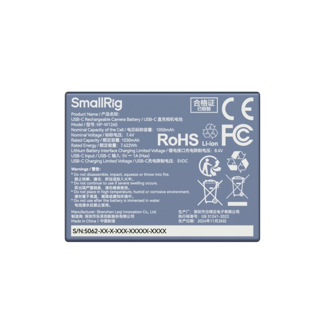 Nabíjecí baterie SmallRig NP-W126S USB-C pro fotoaparáty 5062 umožňuje nabíjení prostřednictvím powerbanky, napájecího pásku, nabíječky do auta nebo jiných speciálních nabíječek. Díky nabíjení vysokým proudem (5 V 1A) a jmenovité kapacitě 1050 mAh můžete baterii naplnit za 2,5 hodiny a provozovat ji delší dobu. Tato vizuálně výrazná baterie, plně dekódovaná bez vyskakovacích oken, má matné pláště z ABS a PC, které jsou odolné proti ohni a trvanlivé. Má naprosto stejnou velikost jako originální baterie fotoaparátu, tudíž se nemusíte obávat, že by se zasekla.