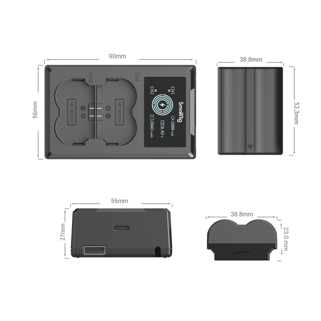SmallRig Sada baterií a nabíječky NP-W235 3822 obsahuje dvě baterie a jednu nabíječku. Baterie je vybavena kompletním dekódovacím čipem, dokonale podporuje různé fotoaparáty, aniž by způsobovala vyskakování, a má vysoce kvalitní ohnivzdorný plášť z ABS a matného PC, který zajišťuje měkký dotek a odolnost. Má stejnou velikost jako originální baterie, a proto se bez problémů vejde do přihrádky na baterie. Duální nabíječka dokáže nabíjet dvě baterie současně, přičemž na LCD displeji se v reálném čase zobrazuje nabíjecí napětí, proud a nabitá kapacita. Je vybaven vestavěným nabíjecím kabelem USB-A a vstupním rozhraním USB-C, které umožňuje nabíjení přes adaptér USB, nabíječku do auta nebo powerbanku.