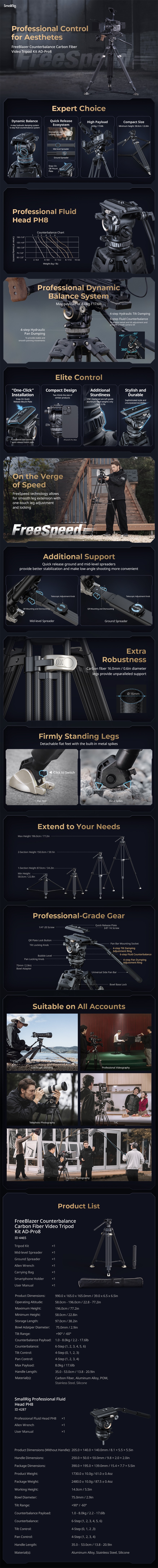 SmallRig FreeBlazer 4465 je profesionální sada videostativu s výškou 58 – 196 cm (97 cm ve složeném stavu), rychloupínacími zámky novou pro rychlou instalaci a fluidní hlavou s nastavitelným šestistupňovým systémem protiváhy. Pokud je výška těžiště 55 mm, šestistupňový systém protiváhy vyvažuje fotoaparát nebo celé rigy až do váhy 8 kg, nastavitelný čtyřstupňový hydraulický systém tlumení zaručuje plynulé švenkování a náklon kamery. Fluidní hlava PH8 využívá novou konstrukci rychloupínací destičky Touch-and-Go, která nevyžaduje seřízení a je účinnější než tradiční zásuvné destičky. Odnímatelná teleskopická rukojeť umožňuje upevnění na levou i pravou stranu, takže je vhodná pro libovolný úchop. Lehké, ale robustní nohy stativu z uhlíkových vláken mají vyměnitelné ploché nohy a hroty, spodní a středové rozpěry a vodováhu. Součástí balení je také brašna pro skladování a ochranu stativu během transportu.
