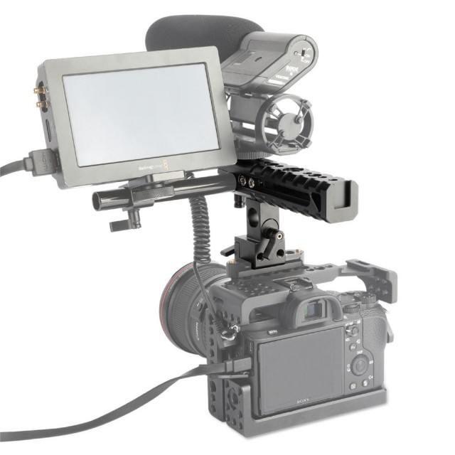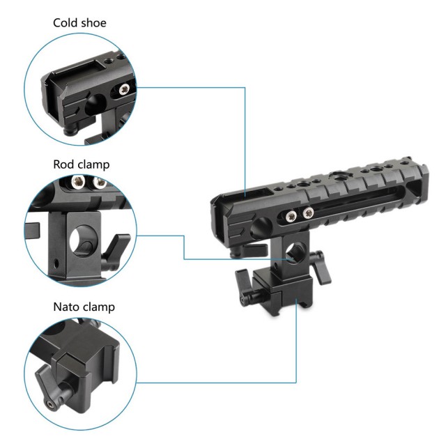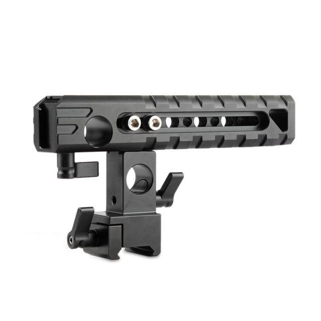 Integrovaný držák na botku na horní straně pro upevnění světel na fotoaparátu, mikrofonních rázových držáků apod. další integrovaný držák na botku na konci rukojeti pro upevnění držáku EVF apod. rukojeť je dodávána se vzorem otvorů pro kolíky pro upevnění příslušenství ARRI. 1/4''-20 a 3/8''-16 otvory na rukojeti pro upevnění dalšího příslušenství. Mezitím vám e*významně drážkovaná povrchová úprava s řadou montážních bodů nabízí pohodlné uchopení. rukojeť je ideální pro snímání v nízkém režimu a snadnou přepravu fotoaparátu.