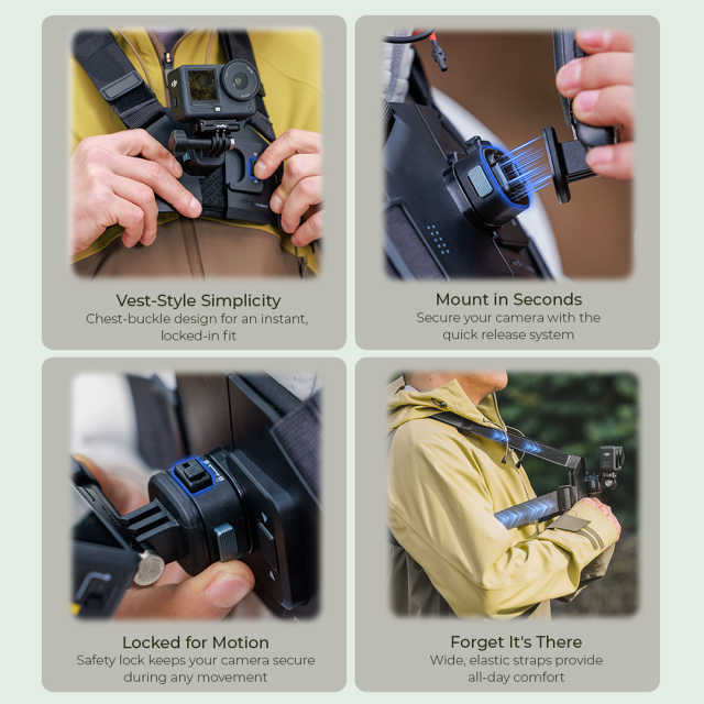Rychloupínací hrudní popruh SmallRig pro akční kamery 5720 je navržen pro stabilní natáčení bez použití rukou v dynamickém venkovním prostředí. Jeho design ve stylu vesty umožňuje rychlé nasazení nebo sejmutí během jedné sekundy a poskytuje pohodlné a stabilní uchycení pro stabilní natáčení. Je ideální pro venkovní aktivity zahrnující intenzivní pohyb nebo vysokofrekvenční vibrace, jako je rybaření, plavba lodí a lyžování.