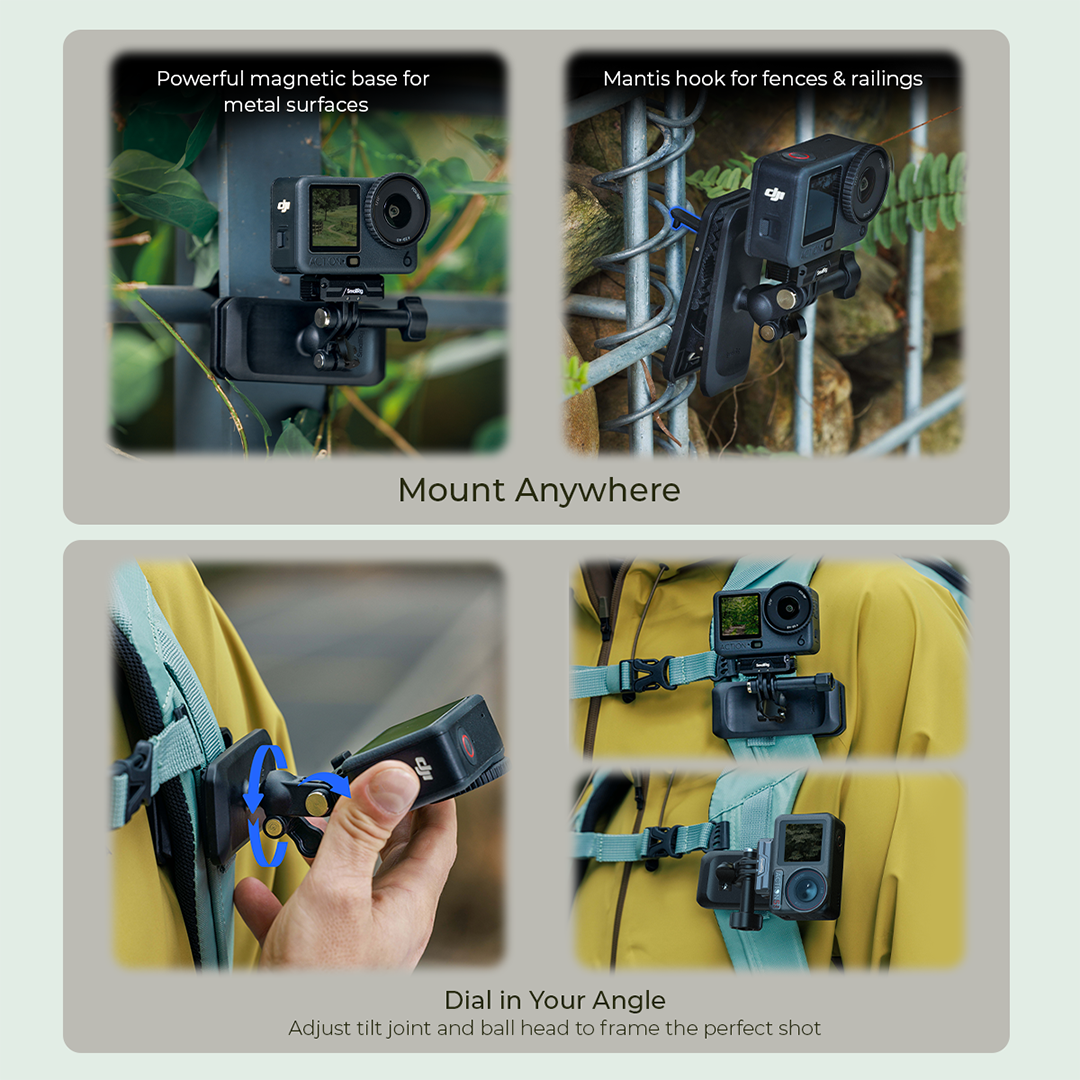 Je kompatibilní s většinou akčních kamer na trhu a je vybaven rychloupínacím rozhraním pro okamžité připevnění a sejmutí kamery, což zvyšuje efektivitu natáčení. Rychloupínací základna obsahuje bezpečnostní zámek, který zabraňuje náhodnému odemčení a zajišťuje bezpečné uchycení během pohybu.