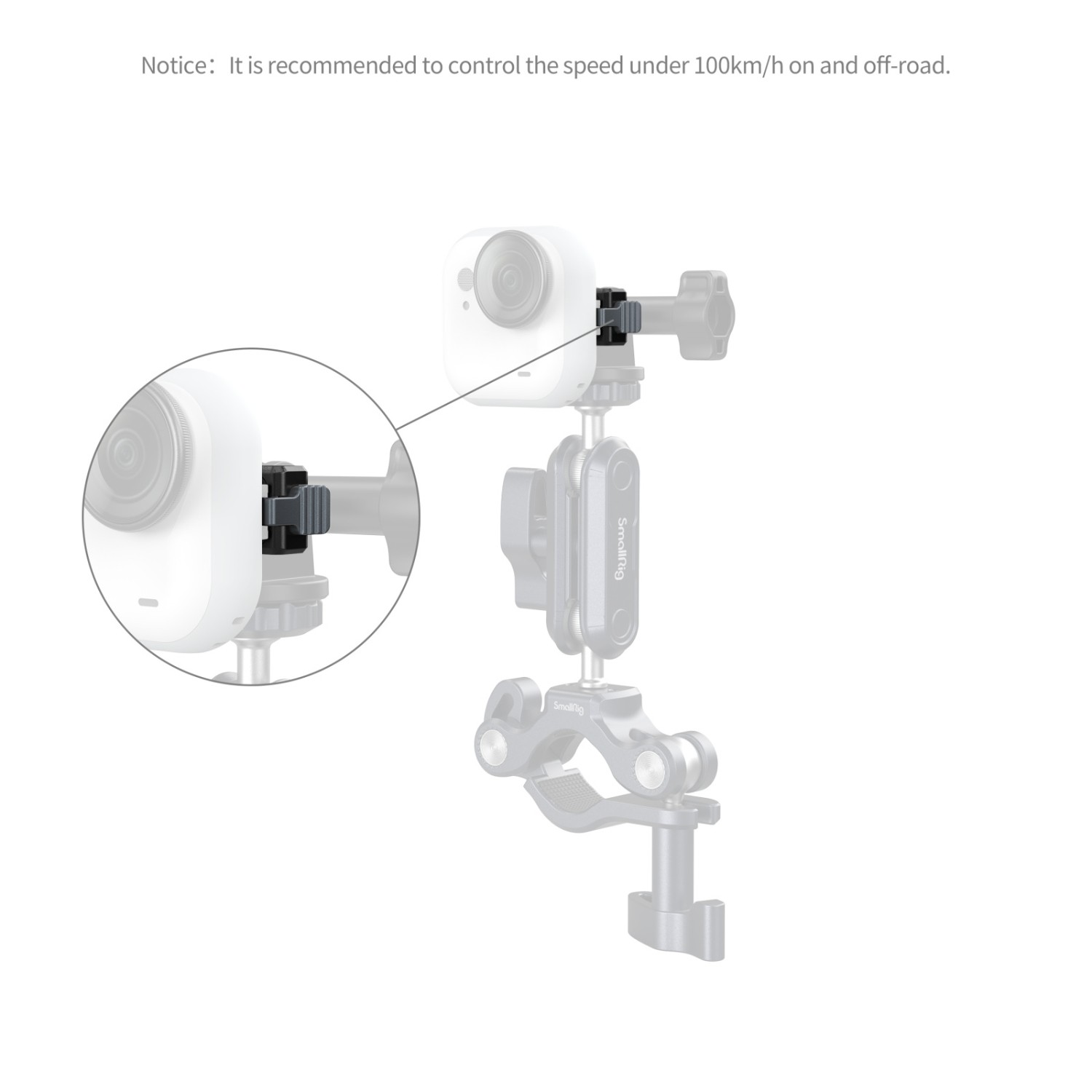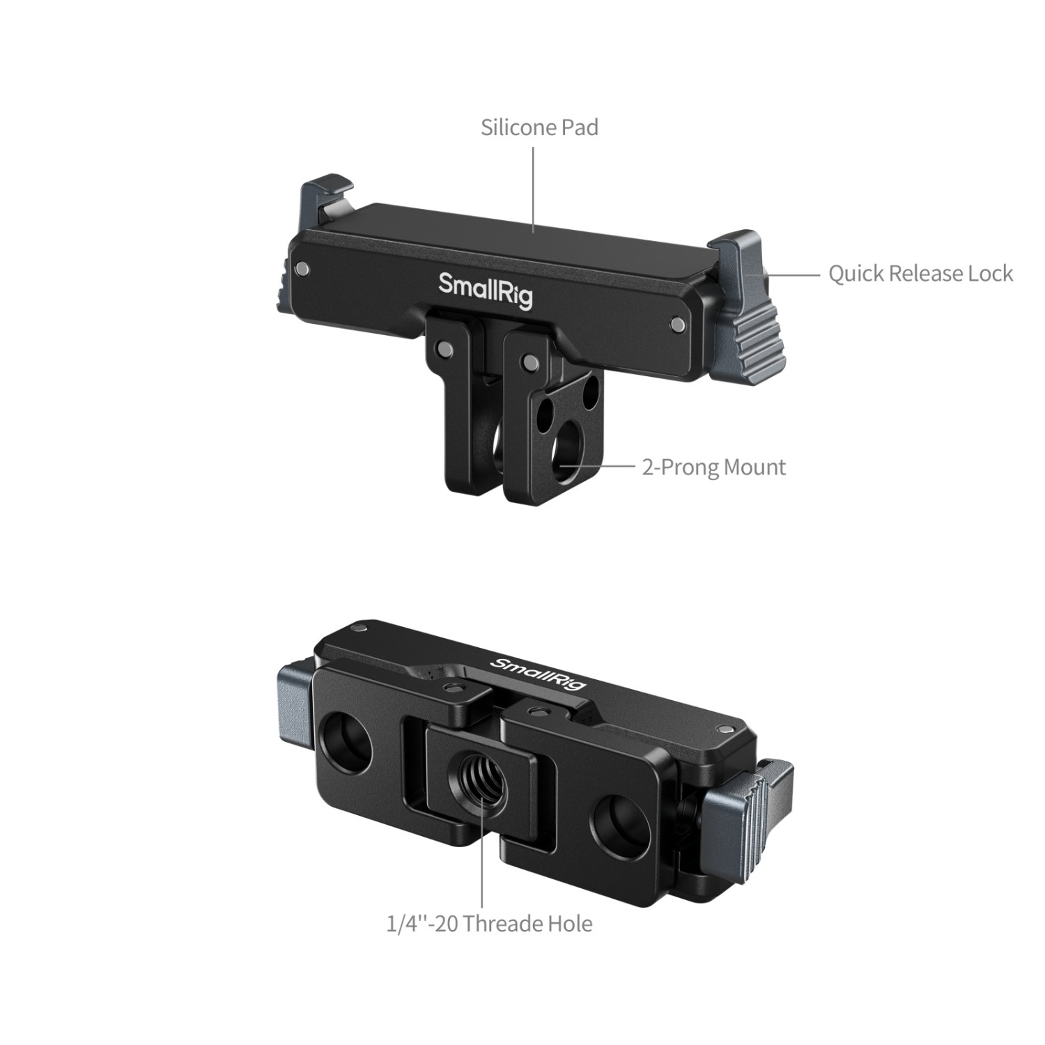 Základna je vybavena sklopným 2-bodovým držákem a závitem 1/4"-20, což zajišťuje širokou kompatibilitu s příslušenstvím SmallRig, jako jsou držáky s přísavkou (ID 4235), krabí svorkou (ID 4102B), selfie tyče (ID 5403) a držáky na krk (ID 5126).