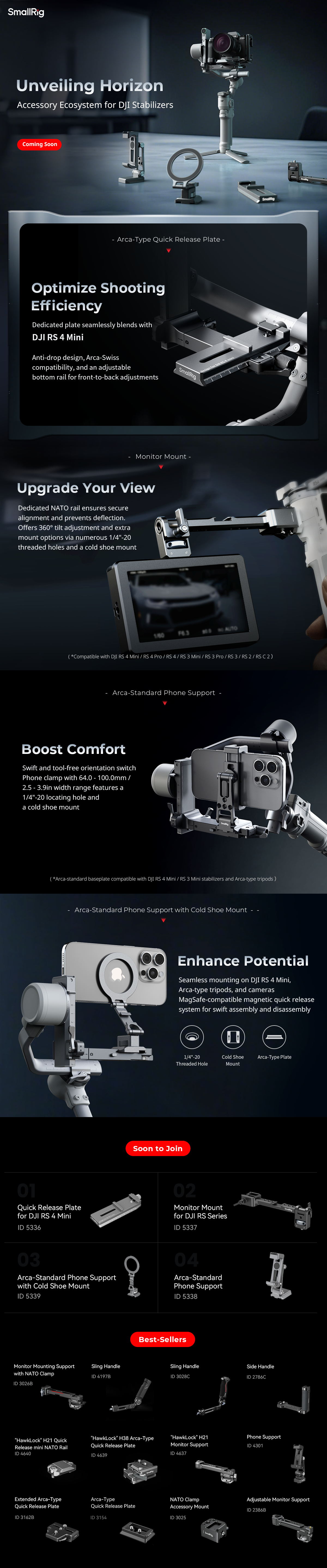 1. Přizpůsobení pro RS 4 Mini: Plně kompatibilní s originální montážní deskou Arca-Swiss, klecí na kameru a L-deskami, což zajišťuje bezproblémovou integraci se stabilizátorem RS 4 Mini.