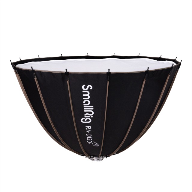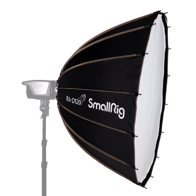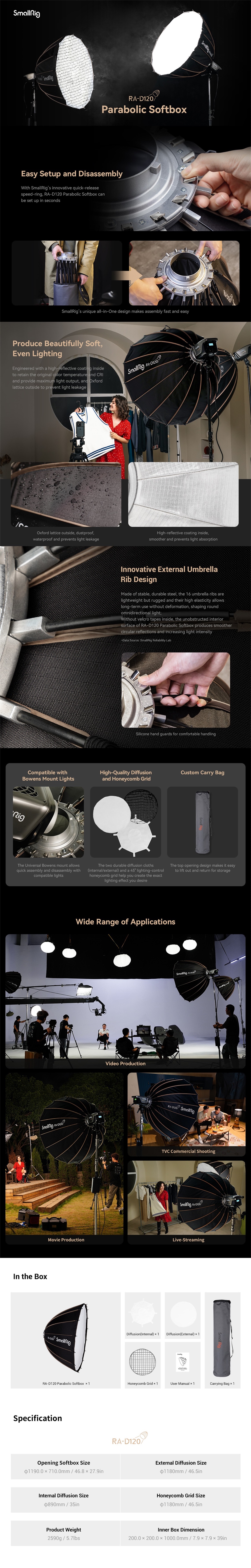 SmallRig RA-D120 Parabolic Softbox je univerzální difuzér o průměru 120 cm. Univerzální držák Bowens podporuje světla SmallRig RC 120D/RC 120B/RC 220D/RC 220B/RC 350D/RC 350B/RC 450D/RC 450B s bodovým zdrojem a další světla s držákem Bowens na trhu. Nová generace samostatně vyvinuté rychloupínací konstrukce umožňuje snadnou instalaci a demontáž během 15 sekund pro lepší uživatelský komfort. Standardně se dodává s 45° voštinovou mřížkou pro zvýšení směrovosti v různých scénách. Používá měkký materiál průmyslové kvality a vysoce reflexní povrchovou úpravu; dvě rozptylky zajišťují účinné změkčení světla nebo vyšší propustnost světla pro uspokojení různých požadavků.