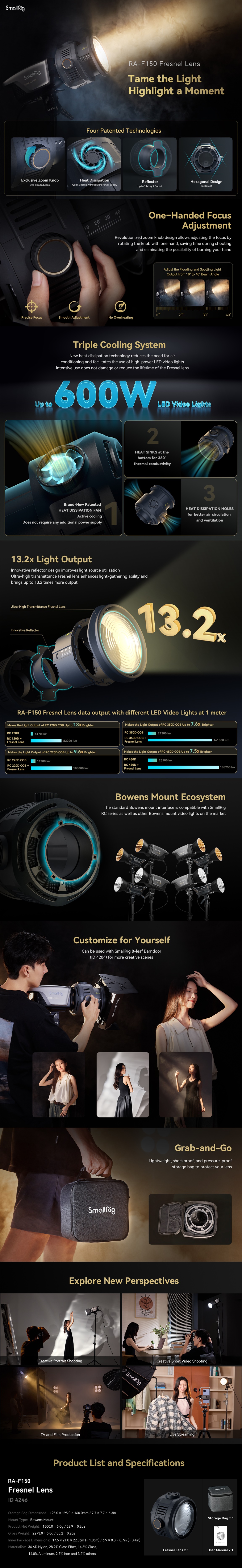 SmallRig RA-F150 Fresnelova čočka 4246 je profesionální zaostřovací nástavec. Umožňuje přesnější zaplavení a bodové osvětlení daného objektu nebo scény. Inovativní konstrukce vysoce propustné Fresnelovy čočky o průměru 150 mm a vestavěného reflektoru přináší desetkrát větší výkon. Inovativní konstrukce pro přiblížení a oddálení umožňuje nastavit zaostření pouze jednou rukou, což šetří čas při fotografování a eliminuje možnost přehřátí ruky. Otáčením tlačítka pro zaostření můžete zalít úhel paprsku od 10° do 40°. Standardní rozhraní pro uchycení Bowens je kompatibilní se světly SmallRig RC120 / 220 / 350 / 450 i s dalšími světly s uchycením Bowens na trhu. Tato Fresnelova čočka může také spolupracovat s osmilistými světlomety SmallRig Barndoors a vytvářet tak další světelné efekty.