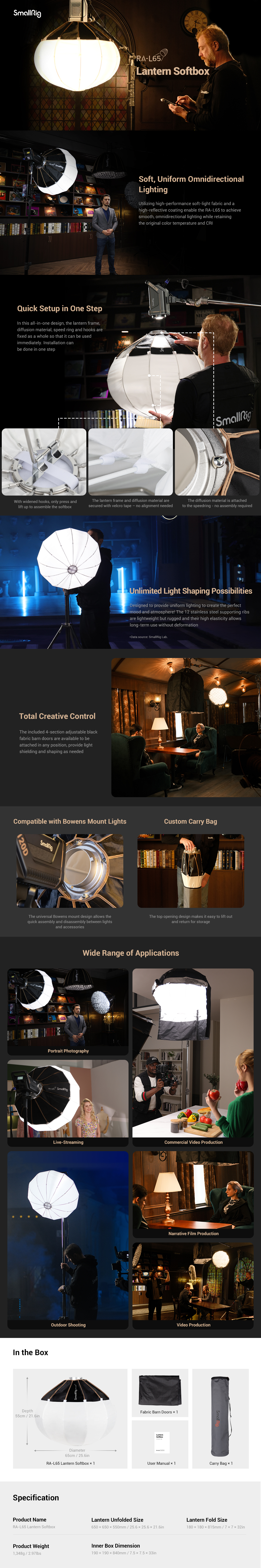 Softbox SmallRig RA-L65 Lantern 3754 je univerzální příslušenství o průměru 65 cm. Úhel paprsku 270° a měkká tkanina průmyslové třídy vám zajistí rovnoměrnější a měkčí světelný efekt.