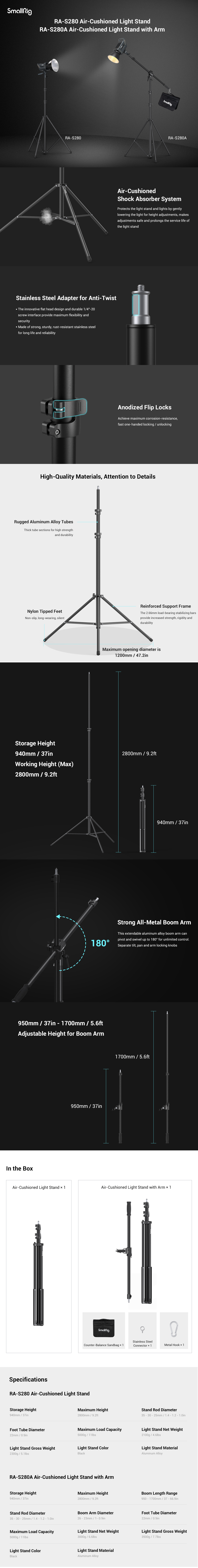Konstrukce se vzduchovým polštářem chrání světla a prsty před náhodným pádem. Volně nastavitelná výška od 94 cm do 280 cm, vhodná pro různé scénáře; délka ve složeném stavu 94 cm, snadné přenášení. Vyrobeno převážně z hliníkové slitiny a železa; železná nosná tyč má tloušťku 2,66 mm a šířku 15 mm a knoflík z hliníkové slitiny je pevný a odolný; dodává se s vysokou nosností a rychlým a účinným zámkem na překlopení.