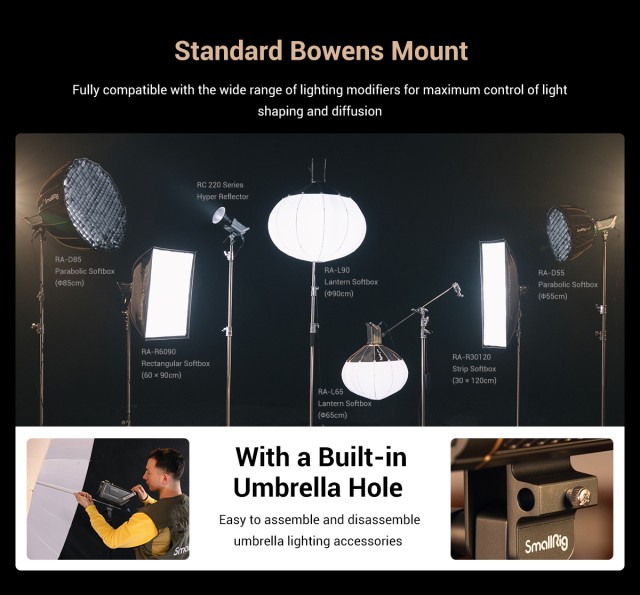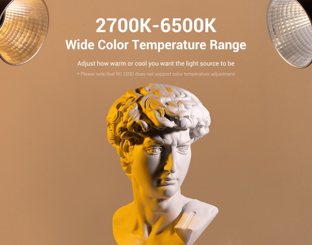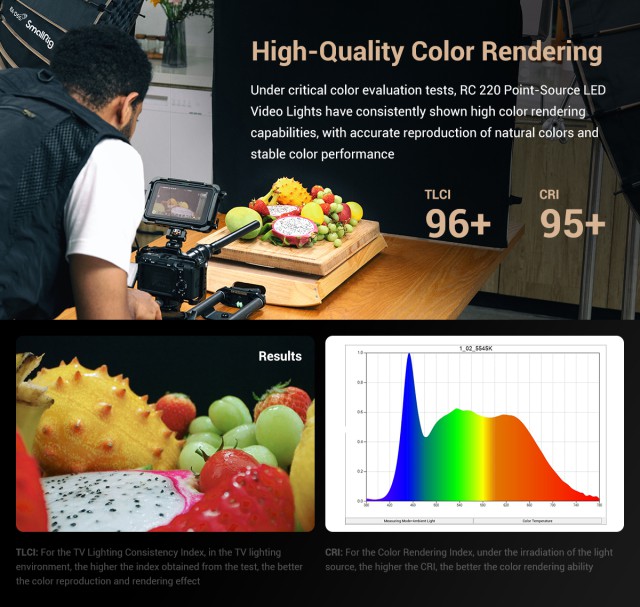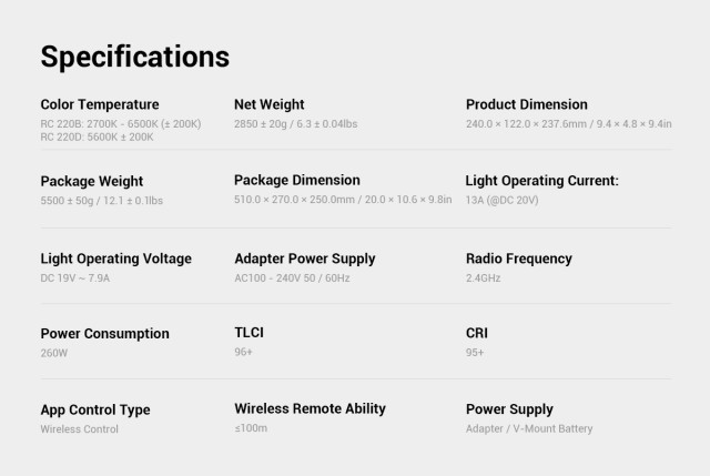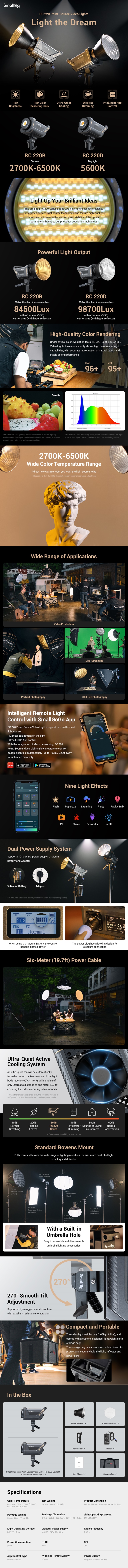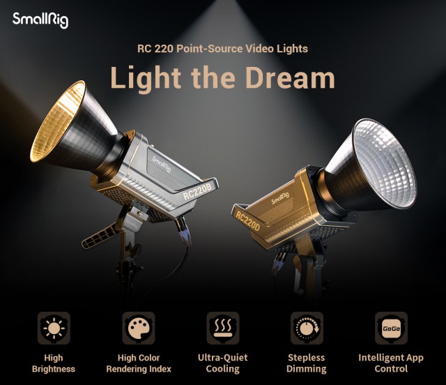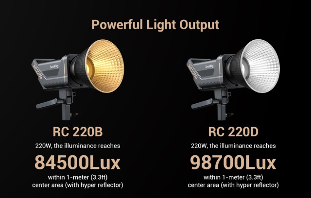 SmallRig RC220D (3618) je dalším, výkonnějším představitelem první generace profesionálních studiových LED světel značky SmallRig. Využívá moderní COB (Chip-On-Board) LED technologii pro vysokou intenzitu (10.100 lx) a také vysoce účinný reflektor pro dosažení intenzity až 98.700 lx ve středu světelného toku ve vzdálenosti 1 m. Nabízí rovněž vysokou barevnou přesnost (CRI 95+, TLCI 96+), bajonet Bowens pro snadnou montáž standardního příslušenství (softboxy apod.) a devět integrovaných efektů (Paparazzi, Firework, Lightning, Fault Bulb, TV, Breath, Flash, Party, Flame), které lze spolu s plynulým nastavením intenzity ovládat jak manuálně, tak bezdrátově pomocí aplikace SmallGoGo. Varianta RC220D má nastavenou barevnou teplotu 5600K (+/- 200K) a max. intenzitu 10.100 lx resp. 98.700 lx s instalovaným reflektorem.