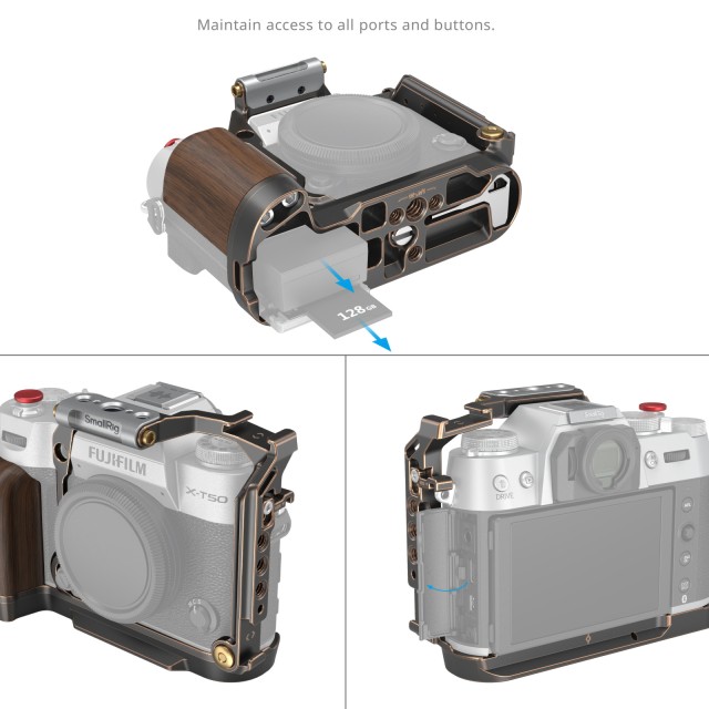 Klec SmallRig „Retro“ pro FUJIFILM X-T50 4714 je navržena tak, aby chránila fotoaparát a poskytovala několik rozšiřujících rozhraní pro snadnější tvorbu obsahu. Klec v retro stylu se k fotoaparátu připevňuje pomocí šroubu 1/4"-20 ve spodní části a bočního zámku na levé straně, silikonové podložky zabraňují poškrábání. Integrovaná ergonomická dřevěná rukojeť zajišťuje pevný úchop. Klec poskytuje volný přístup k tlačítkům fotoaparátu, slotům pro karty, LCD displeji, přepínači MCS, baterii atd. Klec má několik integrovaných rozhraní, která splní všechny vaše potřeby: závitový otvor 1/4"-20, polohovací otvor ARRI 3/8"-16, držák studené patky, otvor pro popruh atd.