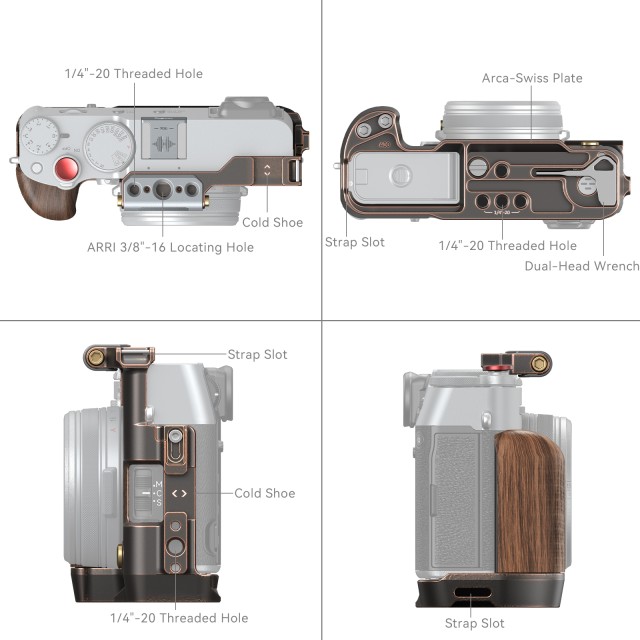 Klec SmallRig "Retro" pro FUJIFILM X100VI 4557 je navržena tak, aby chránila fotoaparát a poskytovala několik rozšiřujících rozhraní pro usnadnění tvorby obsahu. Klec v retro stylu se k fotoaparátu připevňuje pomocí šroubu 1/4"-20 na spodní straně a jednoho bočního zámku na levé straně a silikonové podložky zabraňují poškrábání. Vestavěná ergonomická dřevěná rukojeť poskytuje pevný úchop. Klec poskytuje volný přístup k tlačítkům fotoaparátu, slotům na karty, displeji LCD, přepínači MCS, baterii atd.