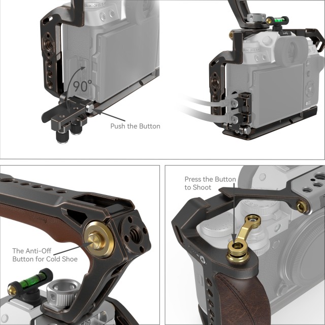 SmallRig Retro Handheld Cage Kit pro FUJIFILM X-T5 3872 je navržen tak, aby usnadňoval fotografování z nízkého úhlu, chránil fotoaparát a poskytoval body pro upevnění příslušenství. Sada obsahuje klec, horní rukojeť a svorku pro kabel HDMI a USB-C a kryt hot shoe. Klec je obdařena novým punkovým stylem s rámečkem adaptéru tlačítka spouště a ergonomickým koženým gripem pro lepší ovládání spouště a lepší zážitek z držení.