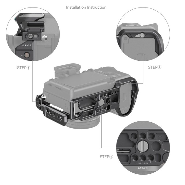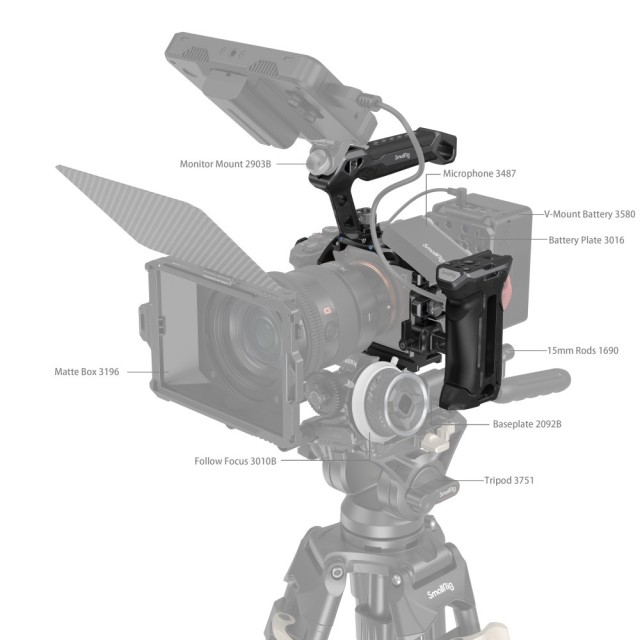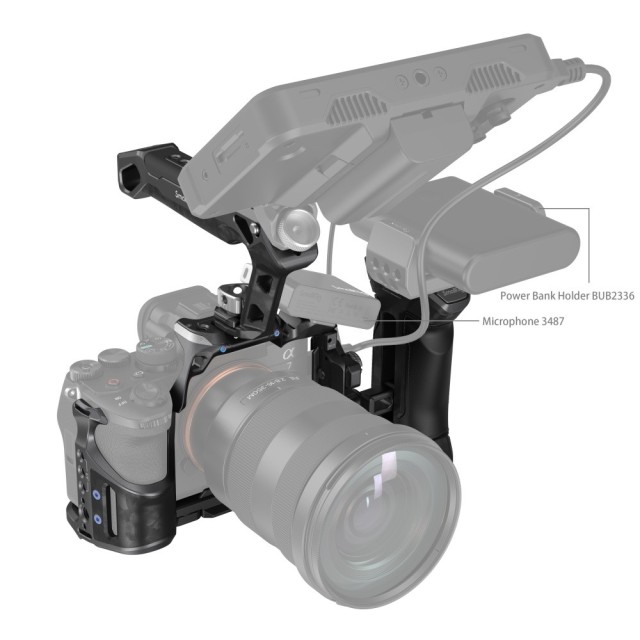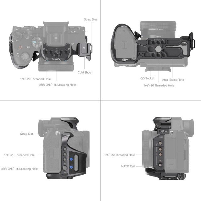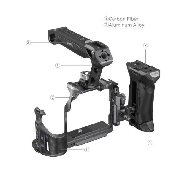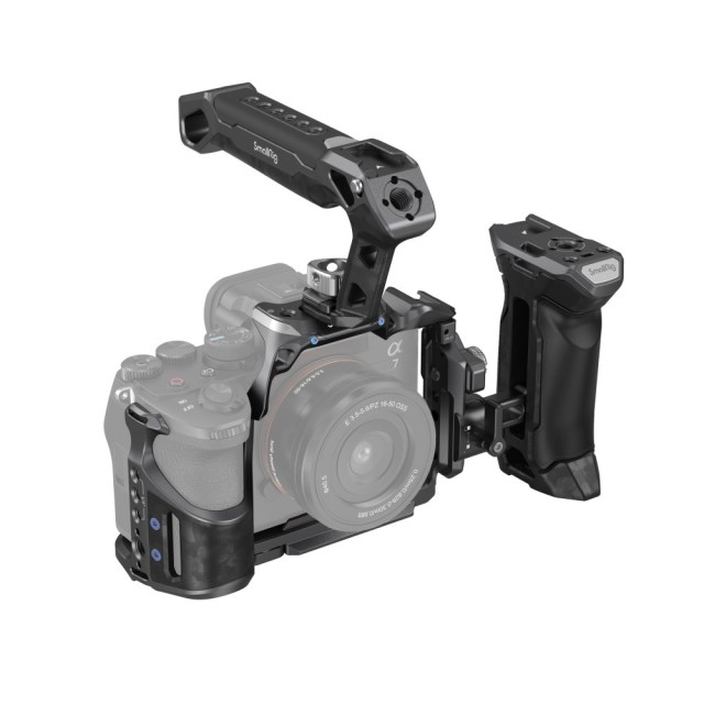 SmallRig "Rhinoceros" Advanced Cage Kit pro Sony Alpha 7R V / Alpha 7 IV / Alpha 7S III 3710 je navržen tak, aby snížil zátěž ramen, zvýšil stabilitu a poskytl body pro montáž příslušenství. Sada obsahuje klec, horní rukojeť, boční rukojeť a svorku pro kabel HDMI. Klec a obě rukojeti jsou přenosné, protože jsou vyrobeny z lehčích uhlíkových vláken, a tudíž umožňují delší fotografování z ruky. V případě klece je fotoaparát společně pevně zajištěn polohovacím kolíkem, šroubem 1/4"-20 a šroubem M2,5. Má čistý zjednodušený design, který umožňuje plný přístup k horním tlačítkům. Horní rukojeť je pohodlná při přenášení a pořizování záběrů z nízkého úhlu; boční rukojeť, vyrobená z lehkých uhlíkových vláken a PU kůže, umožňuje příjemné a pevné uchopení. a svorka kabelu HDMI, utažená pomocí šroubu s plochou hlavou, chrání rozhraní a zajišťuje stabilní přenos signálu. Sada je rovněž vybavena otvory se závitem 1/4"-20 pro rameno Magic Arm 3873, studenými botkami pro mikrofon, LED videosvětlem a polohovacími otvory ARRI 3/8"-16 pro boční rukojeť 2914. Kolejnice NATO a rychloupínací destička Arca-Swiss zvyšují univerzálnost klece. Zejména destička Arca-Swiss umožňuje rychlé přepínání mezi režimy držení z ruky, stativu a gimbalu (DJI RS 2 / RSC 2 / RS 3 / RS 3 Pro).
