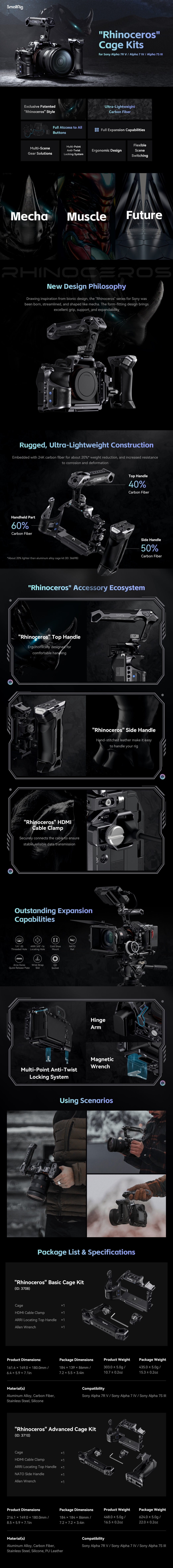 SmallRig "Rhinoceros" Basic Cage Kit pro Sony Alpha 7R V / Alpha 7 IV / Alpha 7S III 3708 je navržen tak, aby usnadňoval fotografování z nízkého úhlu, chránil fotoaparát a poskytoval body pro upevnění příslušenství. Sada obsahuje klec, horní rukojeť a svorku pro kabel HDMI. Klec i horní rukojeť jsou přenosné, protože jsou vyrobeny z lehčích uhlíkových vláken, a tudíž umožňují delší fotografování z ruky. V případě klece je fotoaparát společně pevně zajištěn polohovacím kolíkem, šroubem 1/4"-20 a šroubem M2,5. Má čistý zjednodušený design, který umožňuje plný přístup k horním tlačítkům.