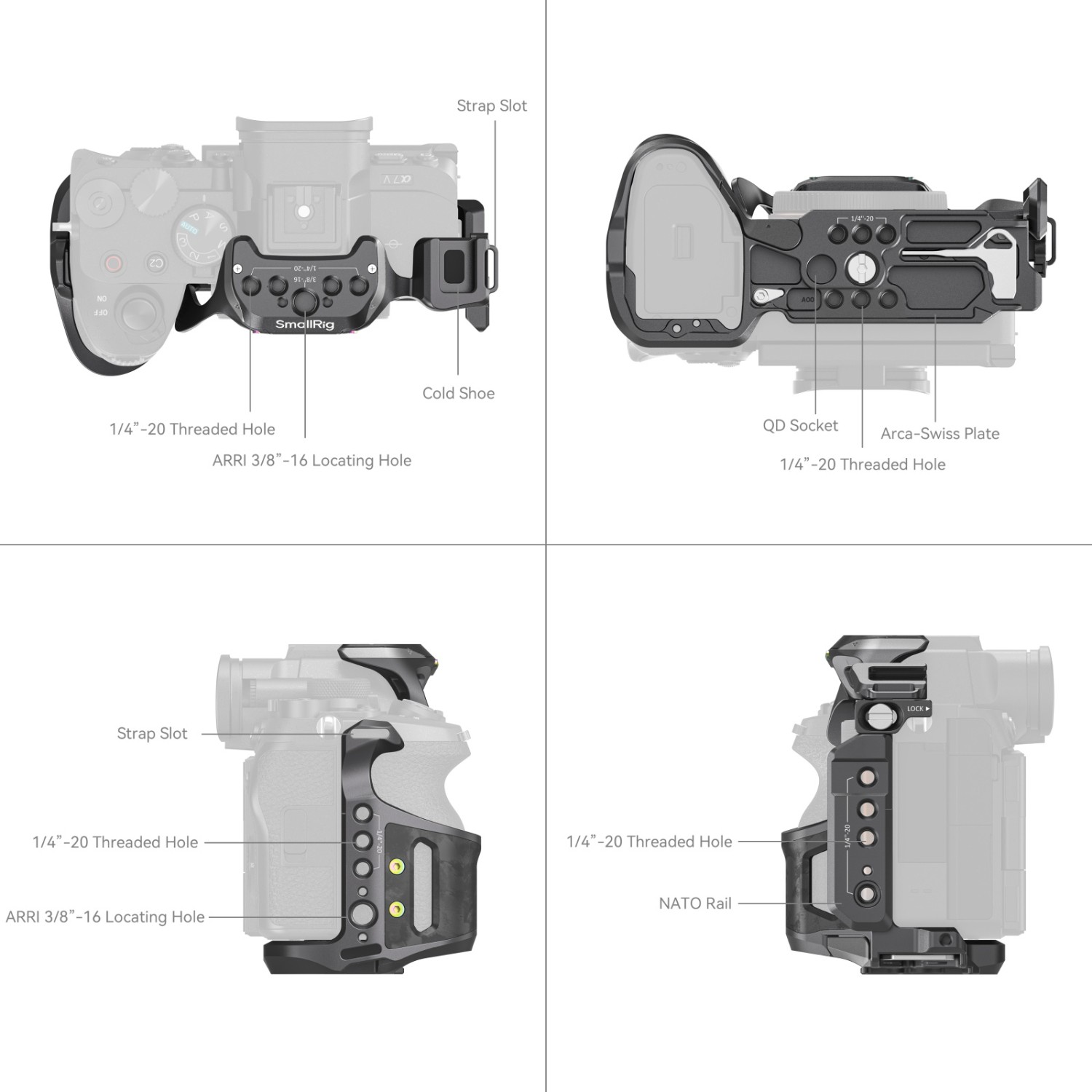 Klec je vybavena tříbodovým uzamykacím systémem se spodním polohovacím čepem, šroubem 1/4"-20 a šroubem M2,5 na levé straně, což zajišťuje bezpečné upevnění bez průhybu, aniž by bylo nutné odstraňovat trojúhelníkové očka fotoaparátu.